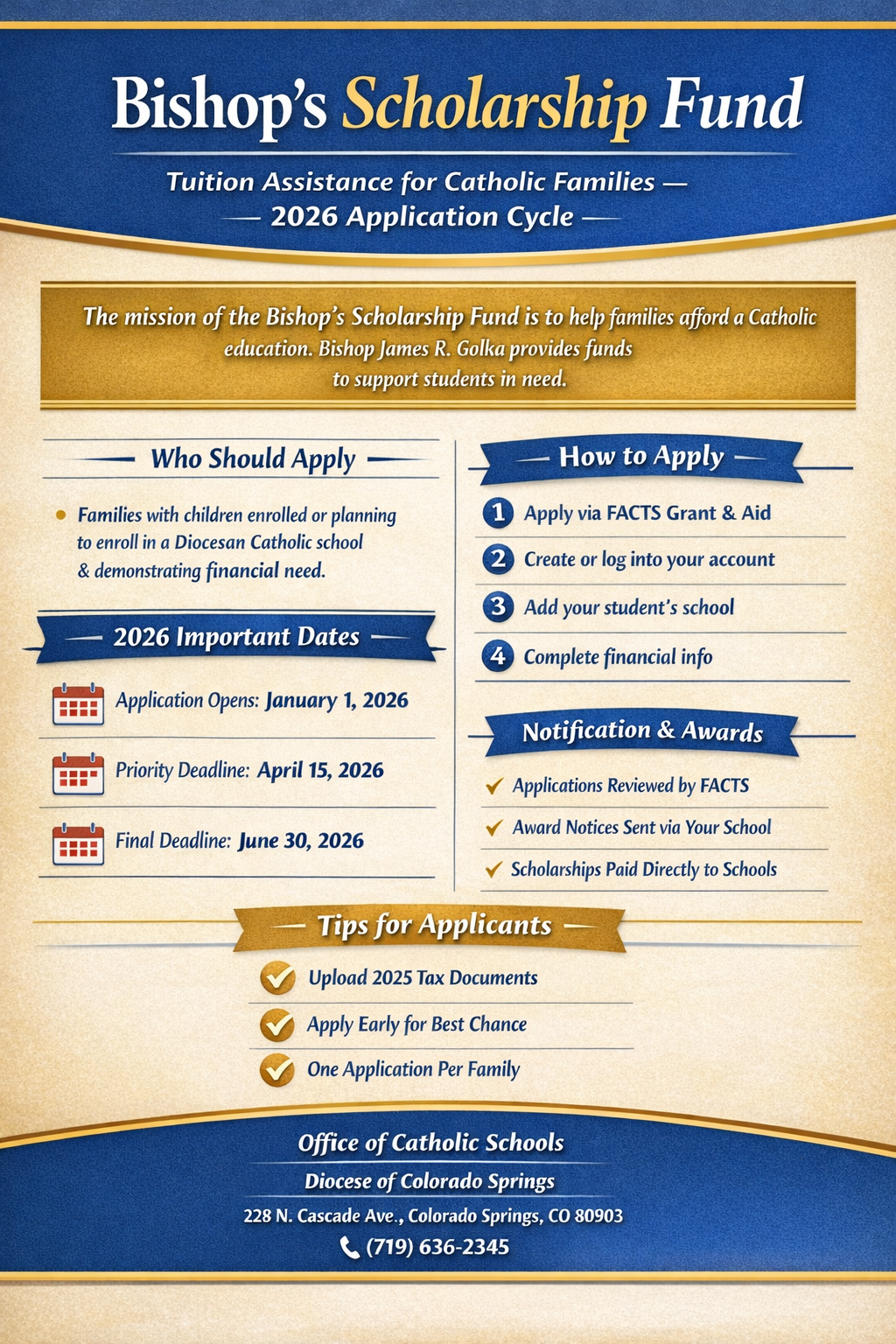 You may also apply for the Bishop's Scholarship Fund for tuition assistance. This is a Diocesan-funded program based on the yearly Returning God's Gifts Campaign. Funds will be distributed based on need (see image below). The application can be found at the FACTS registration page.